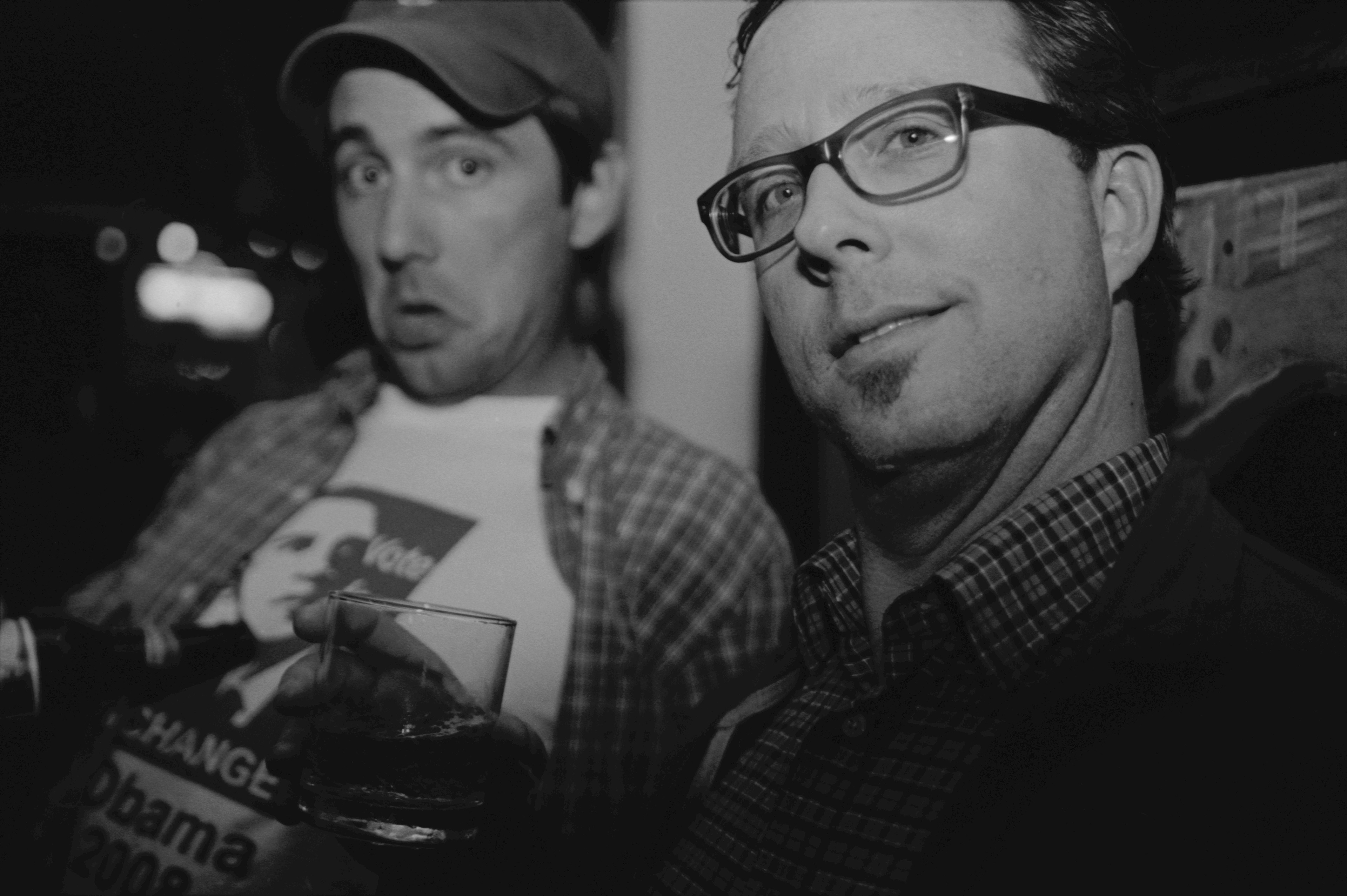 Joe York and John T. Edge celebrate the election returns on November 4, 2008 at City Grocery in Oxford, Mississippi.